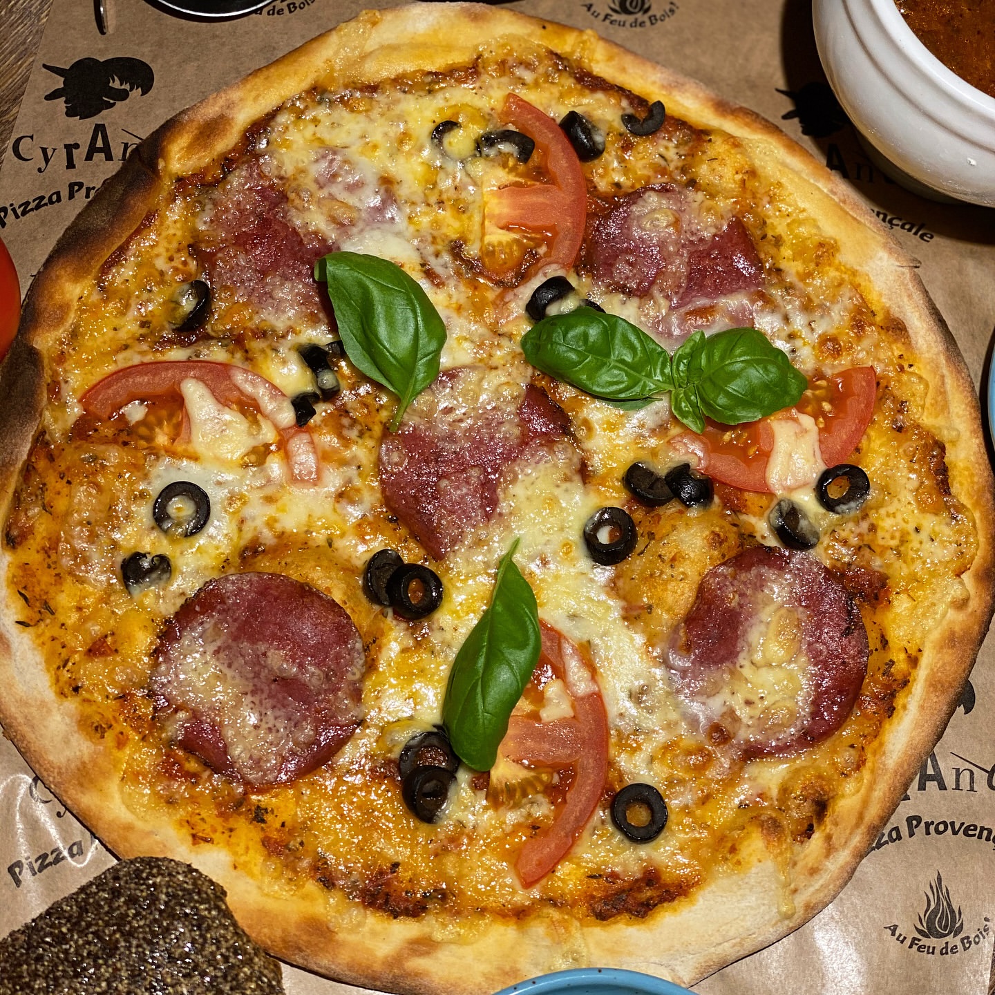 Tomat, ost, mozzarella, salami, tomater & svarta oliver